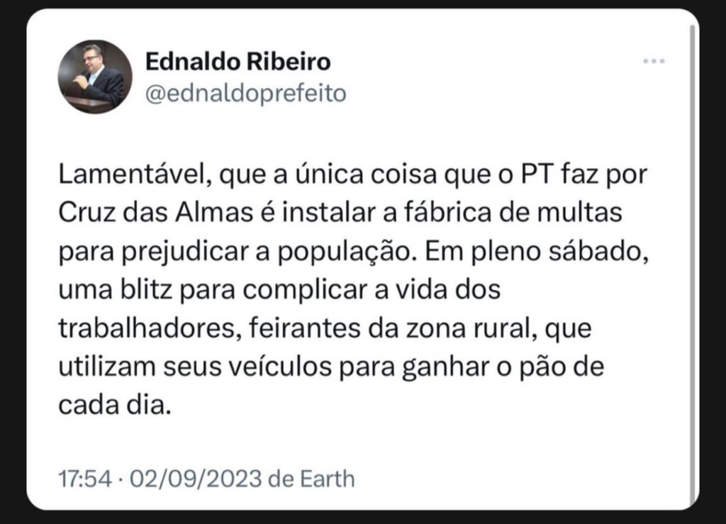 O prefeito Ednaldo Ribeiro, saiu em defesa dos cruzalmenses nas suas redes sociais, após a Polícia Militar e o DETRAN fazerem uma blitz ontem à tarde na Avenida Getúlio Vargas.