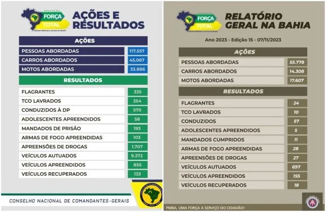 Na Bahia, essa foi a 15ª edição com emprego máximo do efetivo operacional e administrativo. A PMBA abordou mais de 55 mil pessoas e quase 32 mil veículos (carros e motos), resultando na apreensão de 28 armas de fogo, na recuperação de 18 veículos com restrição de furto ou roubo, na prisão em flagrante de 24 pessoas, no cumprimento de 11 mandados de prisão e em 27 registros de apreensões de drogas.