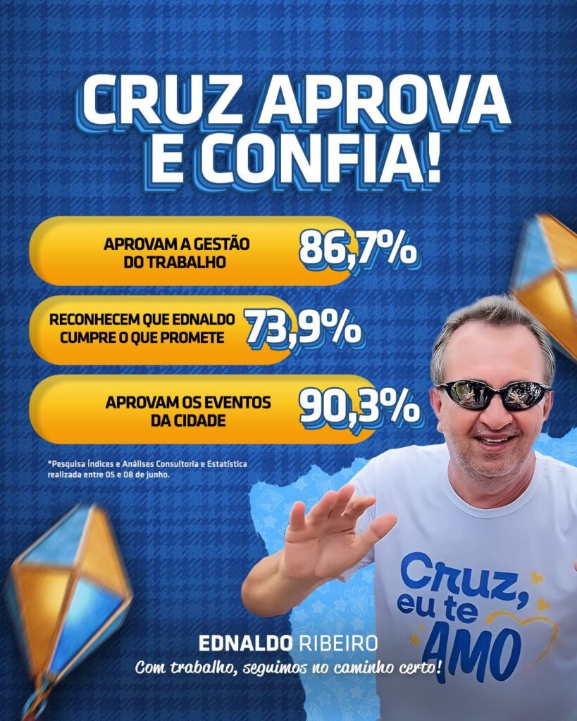 Levantamento realizado pelo Instituto Índices e Análises Consultoria e Estatística entre os dias 5 e 8 de junho de 2025 revelou que 86,7% da população de Cruz das Almas aprova a gestão do prefeito Ednaldo Ribeiro. A pesquisa foi realizada com 705 eleitores do município e aponta um cenário extremamente positivo para a administração municipal.
